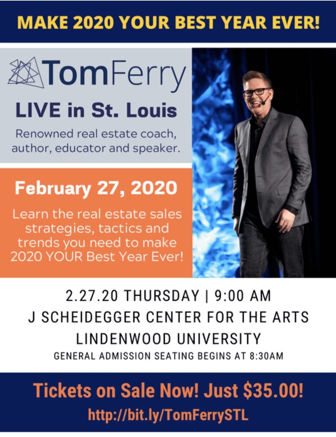 tom-ferry-stlYou won’t want to miss this amazing event from renowned real estate coach, author, educator and speaker, Tom Ferry. Join us at Lindenwood University’s J. Scheidegger Center for the Arts to hear about the 2020 real estate sales strategies and trends you need to stay ahead of the curve.